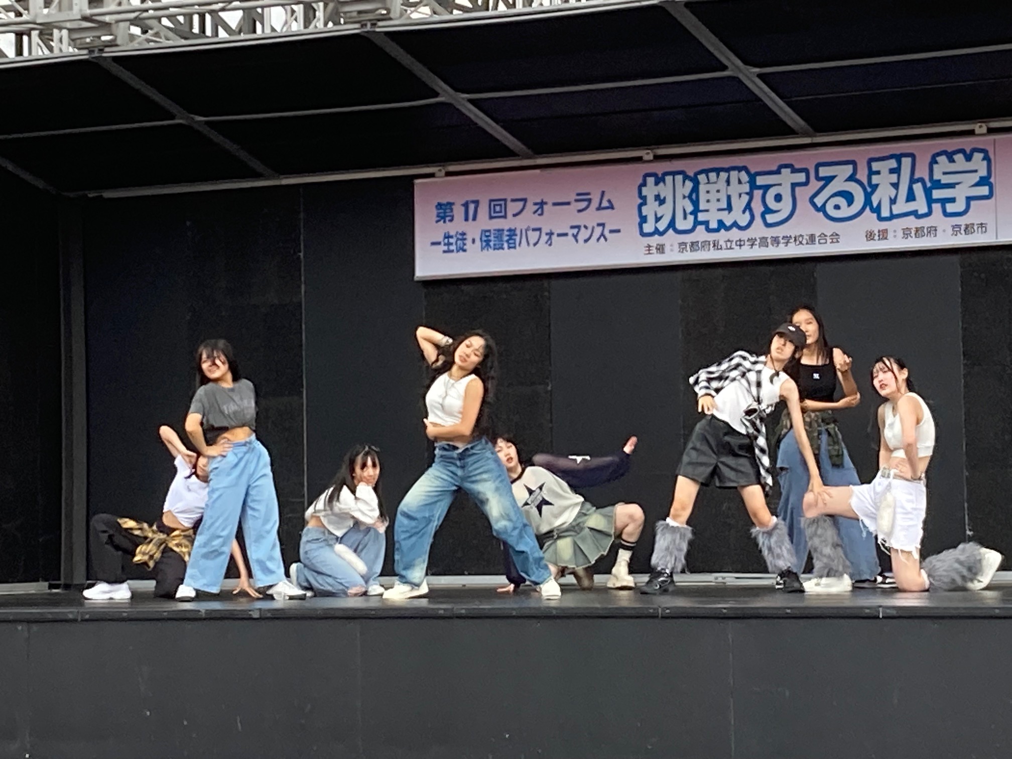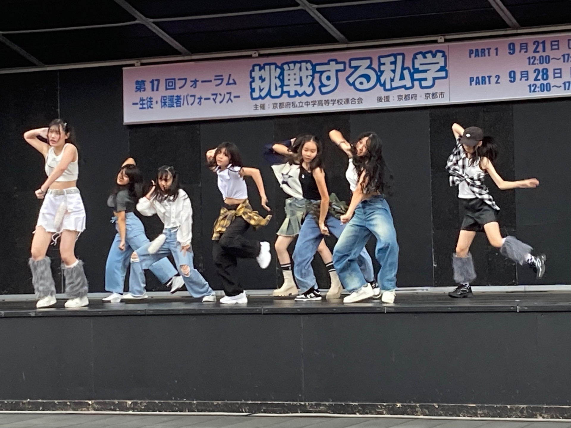 9月28日、京都駅大階段で行われた第17回フォーラム「挑戦する私学」の生徒・保護者パフォーマンスに参加しました。他校のパフォーマンスに圧倒されぎみでしたが、多くの観客の方の前で、自分達の演技を楽しんで踊れたと思います。