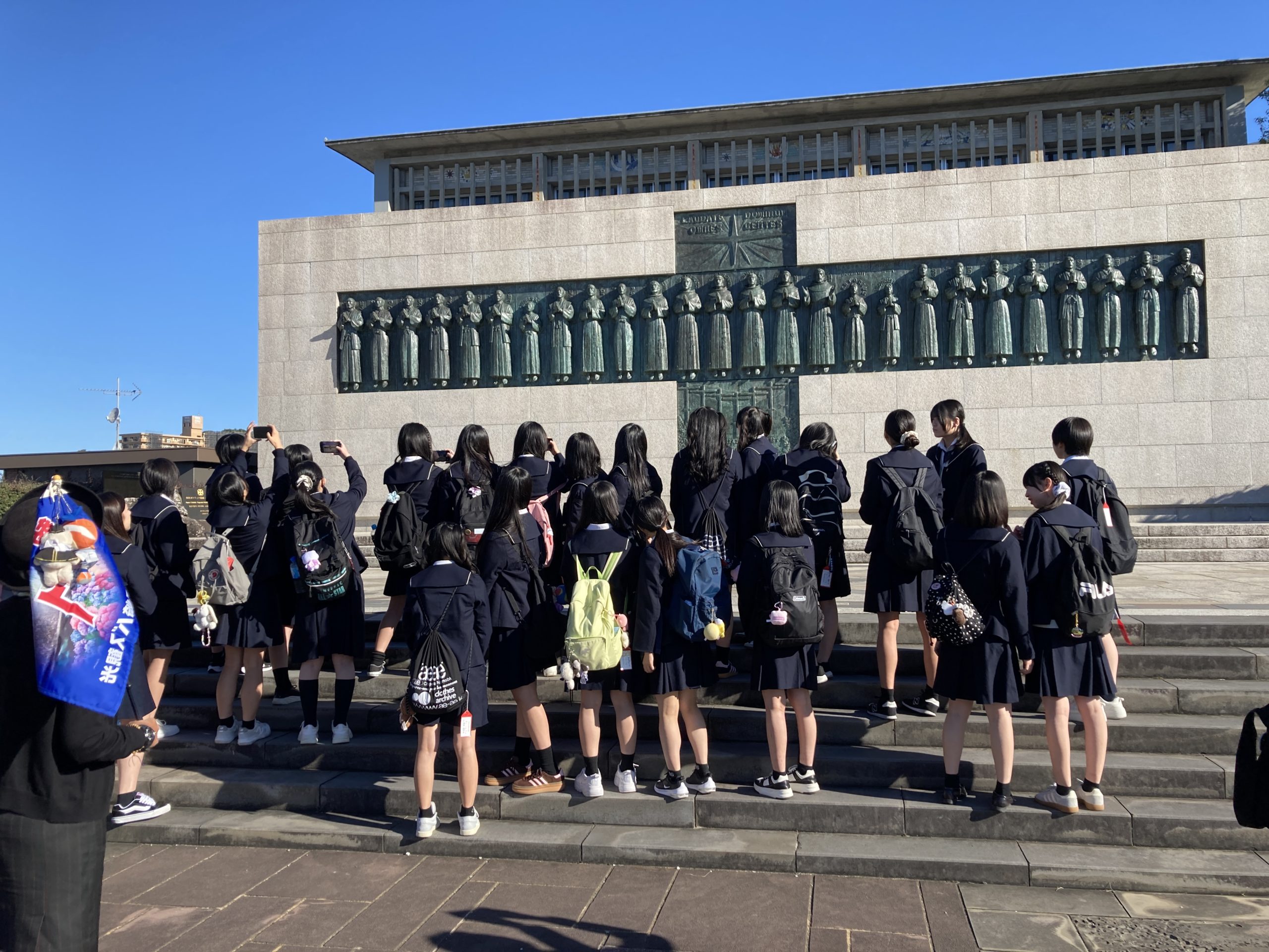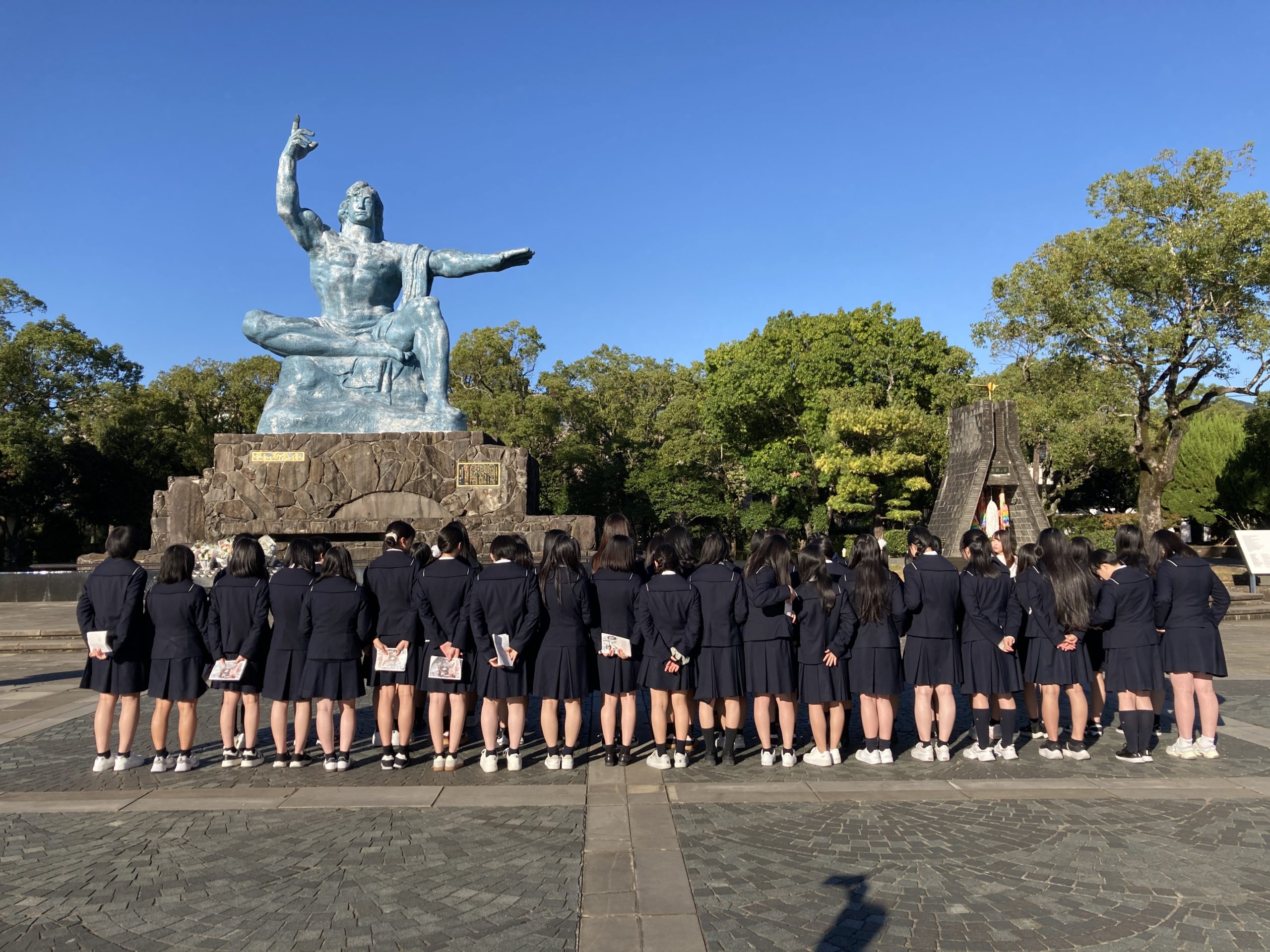 中3学年は研修旅行で長崎・雲仙・熊本・阿蘇に行きました。長崎では班別で自主研修を行い、自分たちの決めたルートで目的地を巡り、さまざまな経験ができました。キリシタン学習では江戸時代の信者達の信仰心の強さを理解し、平和学習では、平和宣言を日本語と英語で読み上げ「戦争は二度としてはならない」という思いを新たにしました。また、熊本城や阿蘇火山博物館を巡って、歴史や自然分野と多岐にわたって学ぶことができました。
