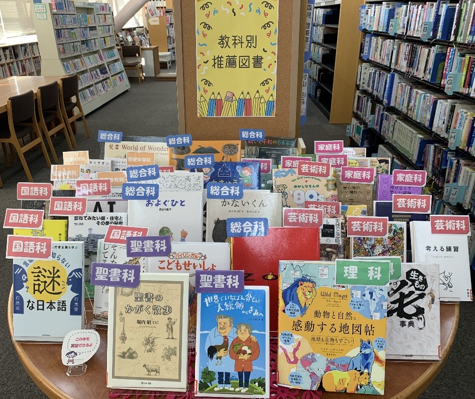 今月の展示コーナーには、毎年恒例となった各教科からの推薦図書が揃っています。気軽に手にとりやすい楽しい本をきっかけに、興味の幅を広げてほしいと思います。