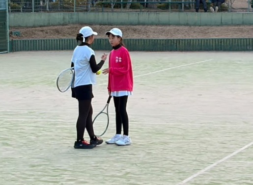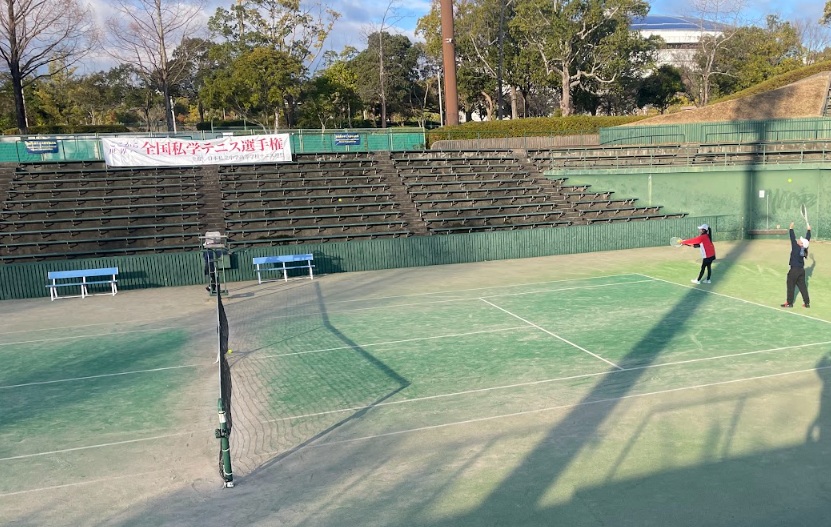 12月25日~28日神戸総合運動公園で開かれた全国私学私立中学校テニス選手権大会に、全国の予選を勝ち抜いた24校が出場しました。この大会はシングルス1本、ダブルス2本の団体戦で行われ、同一対戦では同じ選手が2度出場することはできません。本校は初出場で、中2廣瀬絢萌・林美侑花・多田有沙・井上美波・園田椛乃・中1荒井ななね・井上ともりで参加しました。本戦1回戦で今大会5位になった山陽女学園と対戦し、1-2で敗れました。ベスト8に入れなかった16校で敗者戦が行われ、1回戦静岡英和女学院に2-1で勝利し、2回戦立命館宇治に2-1で勝利しました。3回戦東京1位成蹊とは1-1となり、ダブルス4-3の40-15から逆転され、敗れてしまいました。この結果11位タイで終了しました。全国の強豪の中で雰囲気に飲まれながらも精一杯の力を発揮して、この大会中にそれぞれの成長する姿が見られました。特にプレイだけでなく、生活面や周囲への感謝など学ぶことが多い大会となりました。