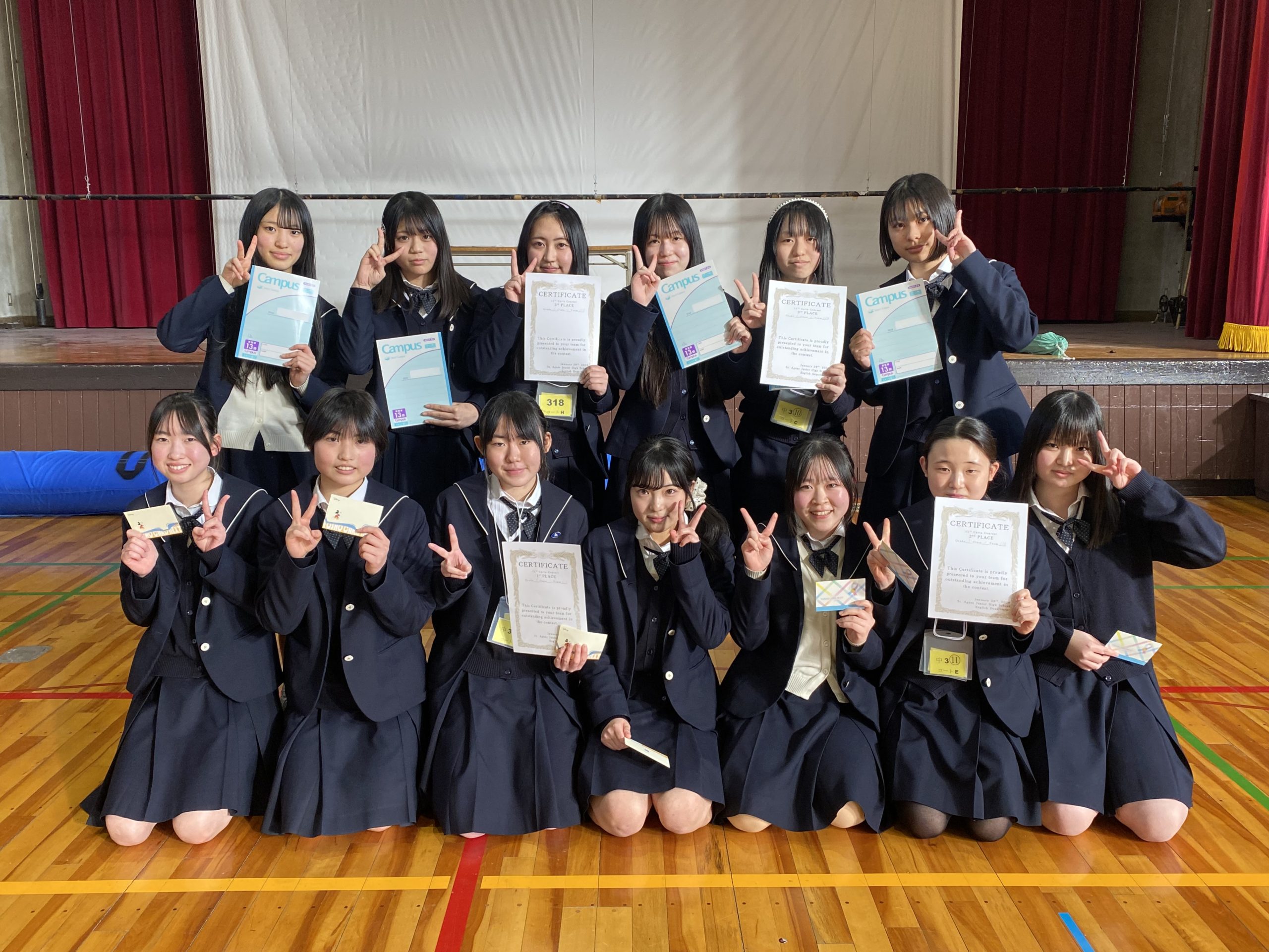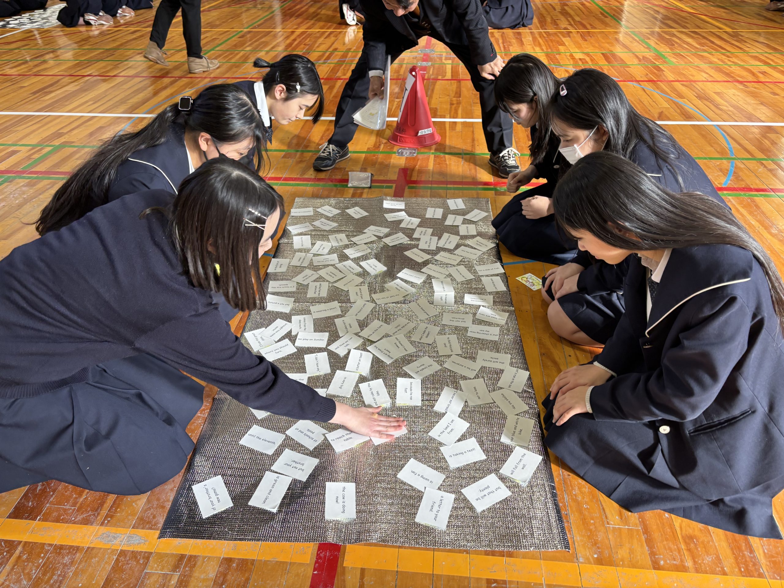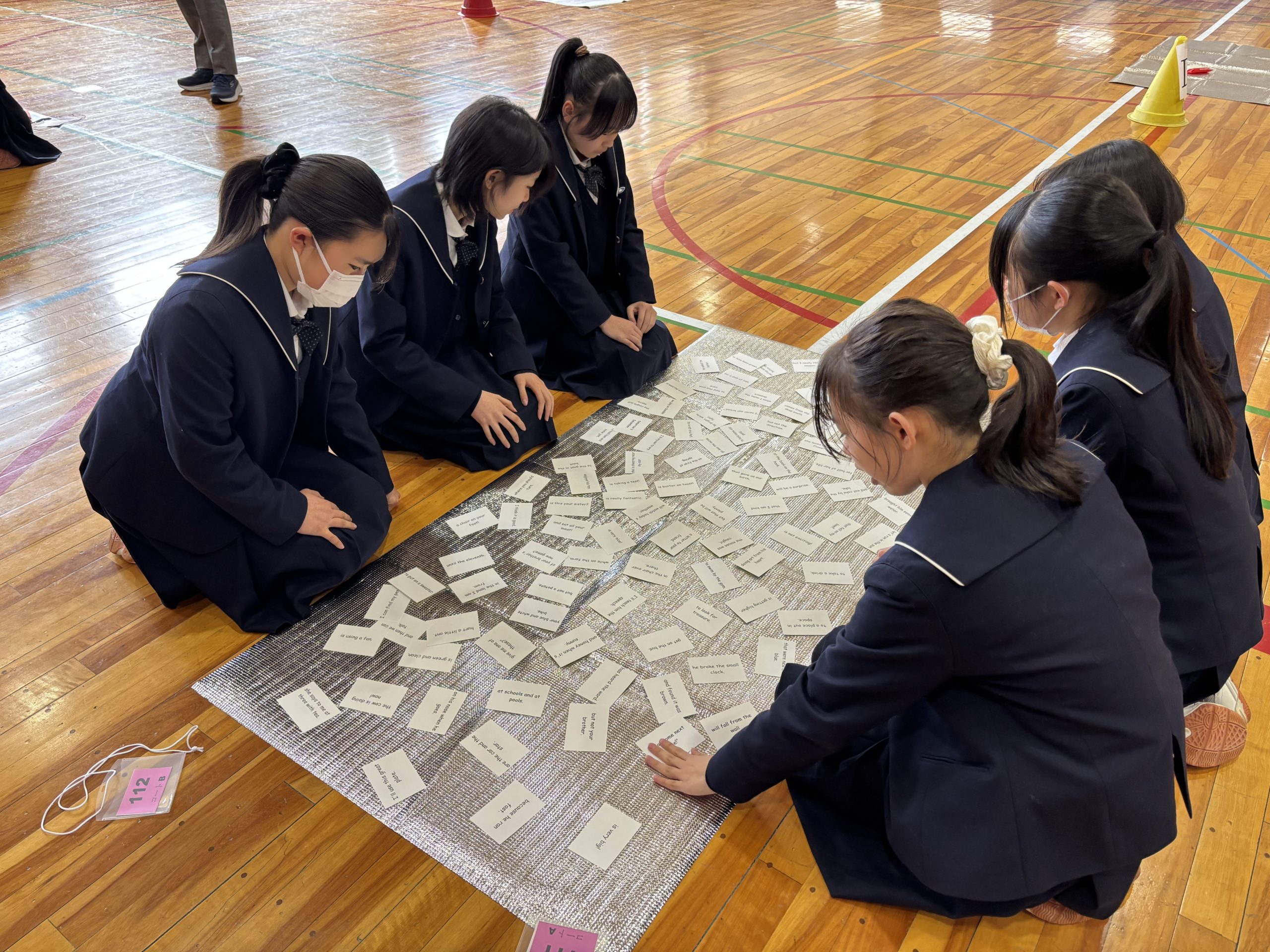 英語ライムタイムカルタ大会は、中学3年間の教科書で学習する語彙や文法を使った本校オリジナル英語カルタ100首を使用し、3学年トーナメント方式で行いました。その結果、3年生311チームが優勝、3年生326チームが準優勝、3年生318・324チームが3位を受賞しました。大会は、大変白熱したものとなり、英語を楽しく学習する機会となりました。