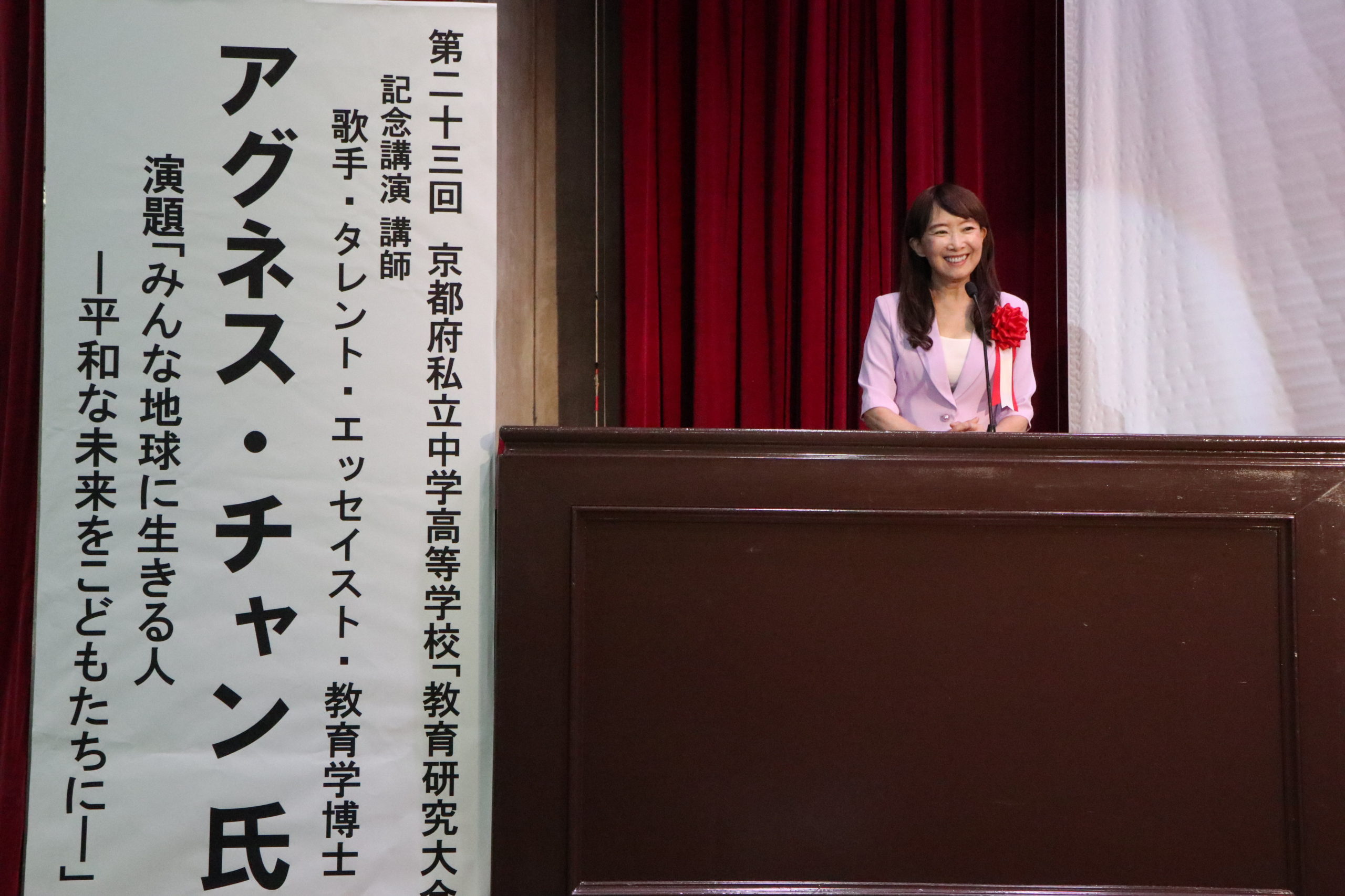 10月19日(日)第23回京都府私立中学高等学校「教育研究大会」が実施されました。この大会は、京都の私学が持ち回りで会場を提供しており、今年は本校が会場校でした。午前に歌手・エッセイスト・教育博士のアグネス・チャン氏を招いて、全体講演会が325名の参加で行われました。午後は、教科や分掌などの16分科会が行われ、407名の参加者がありました。盛況で無事に執り行われ、次年度に引き継ぐことができました。